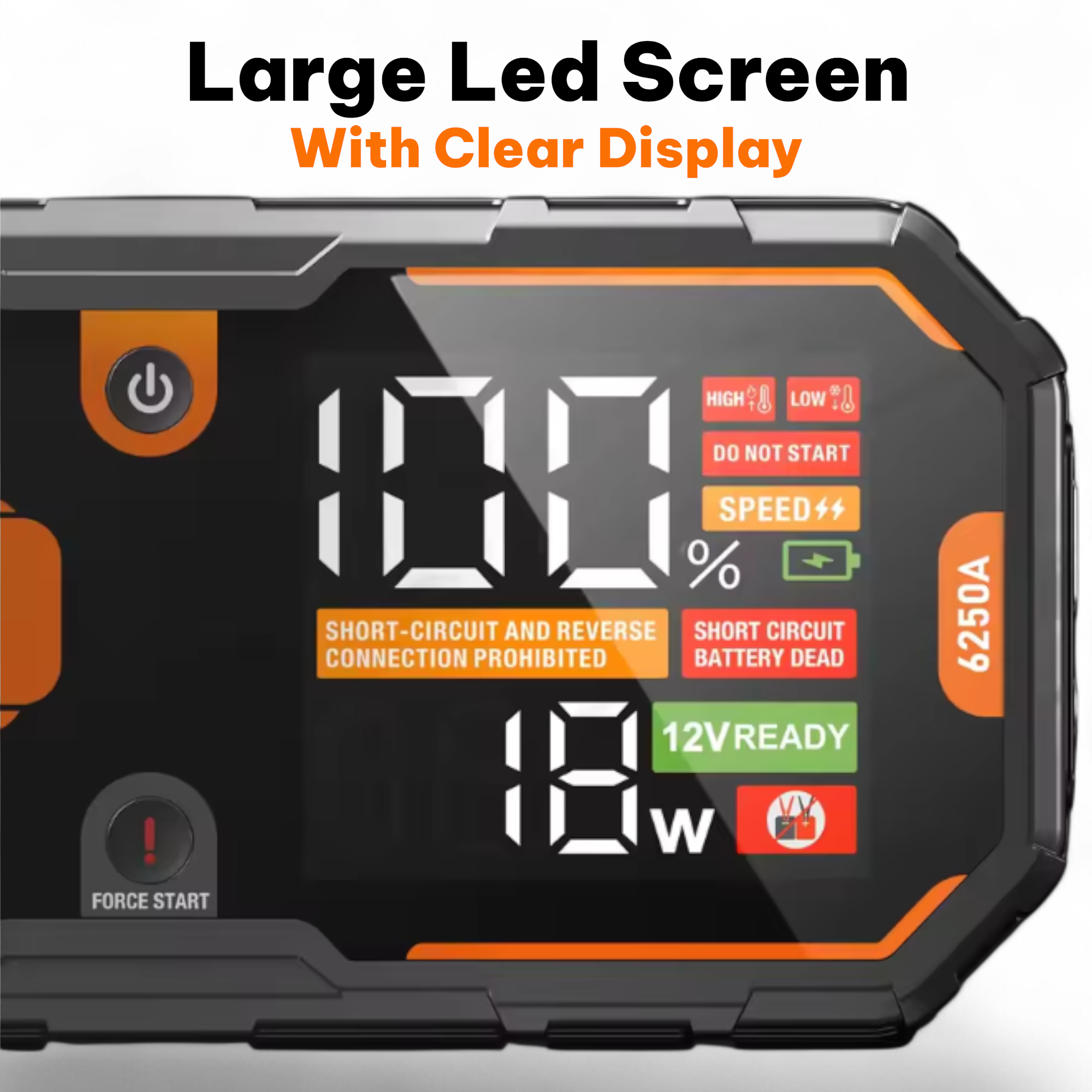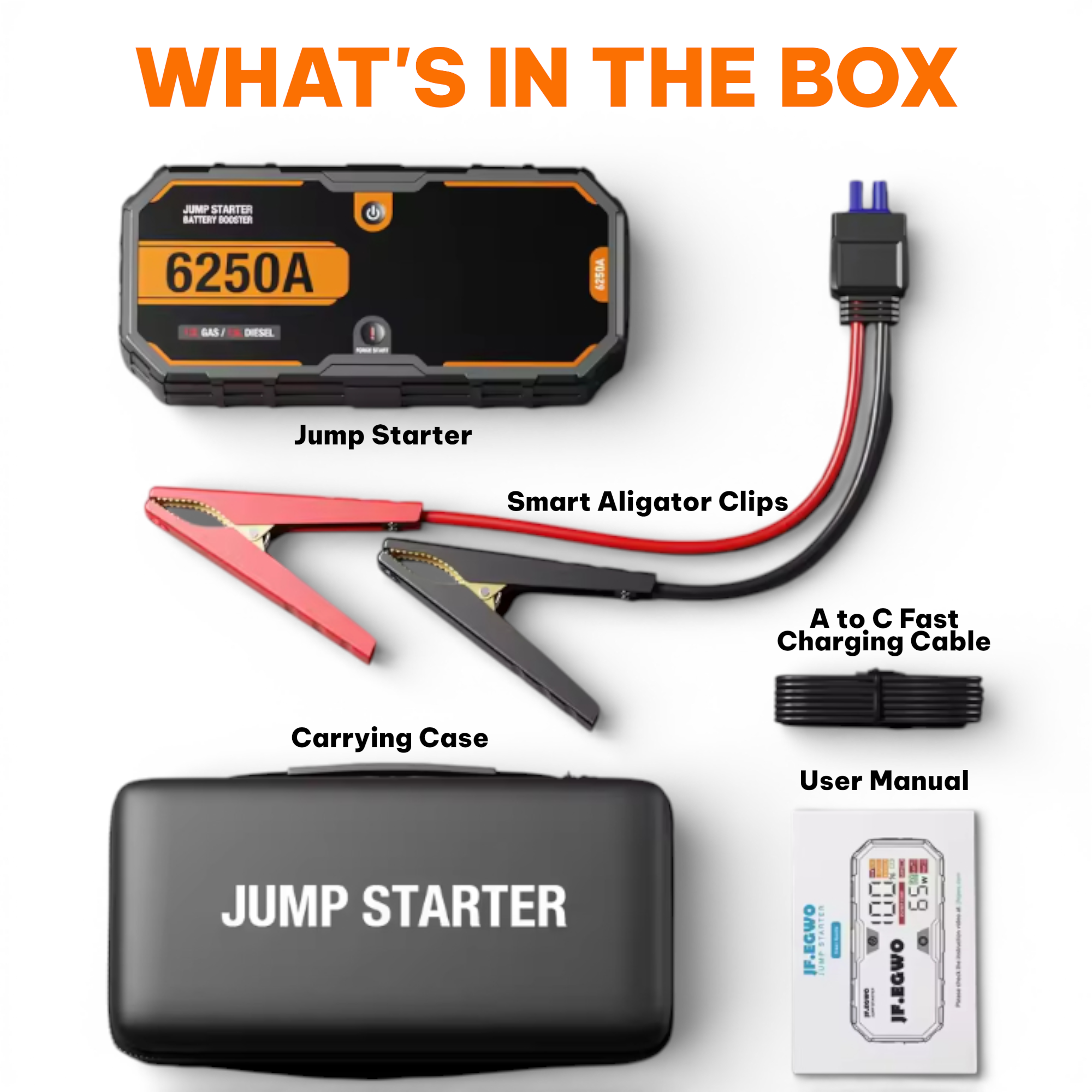 Imagine being stuck in a car park with a dead battery and no one around to help. This powerful 6250A portable jump starter eliminates that nightmare—giving you the power to jump-start your vehicle instantly, anywhere, anytime, without needing another car or waiting for roadside assistance.