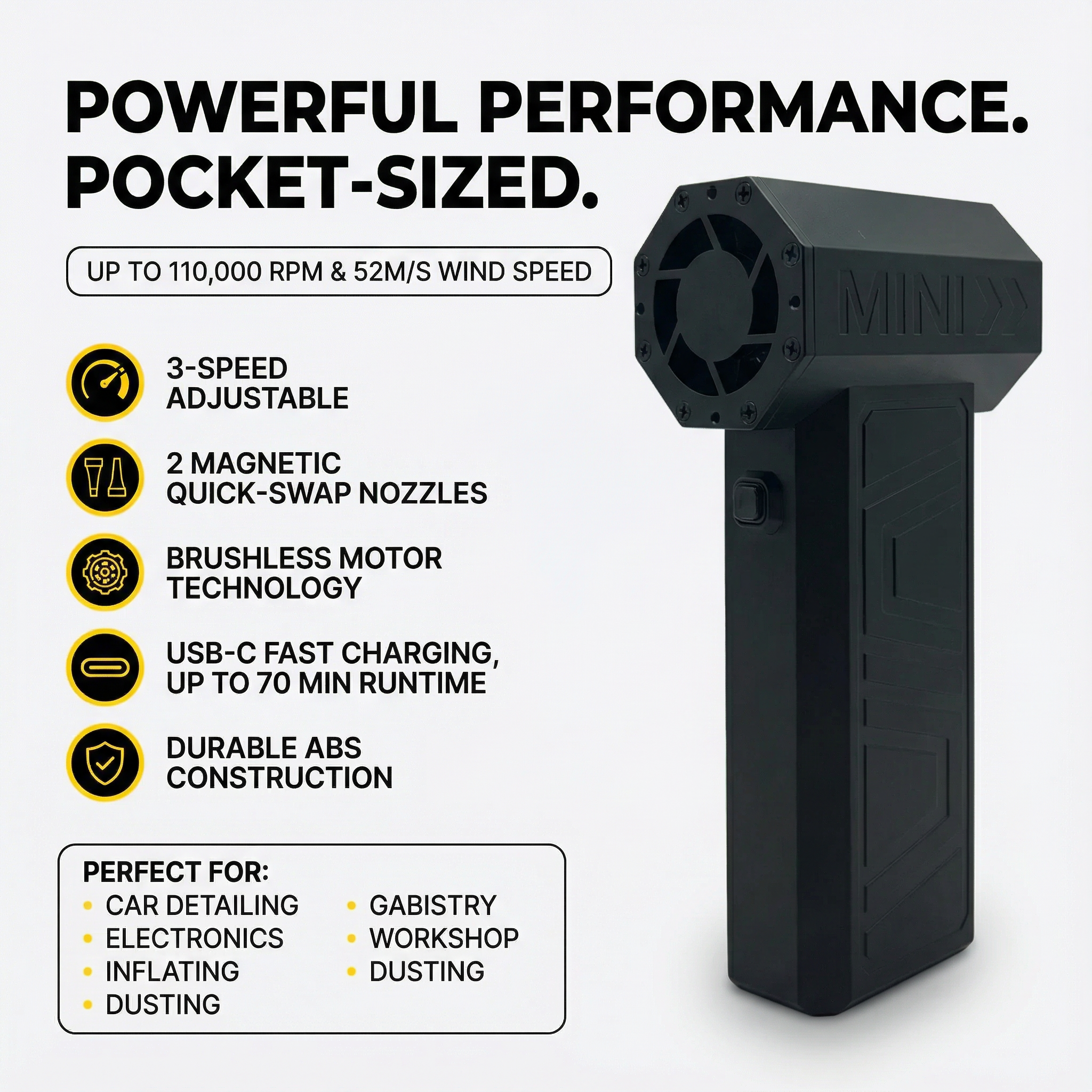- Serious Power, Tiny Size: Delivers up to 110,000 RPM and 52M/S wind speed—powerful enough for car drying, keyboard cleaning, workshop dust removal, and inflating pool toys, yet small enough to fit in your glove box or backpack